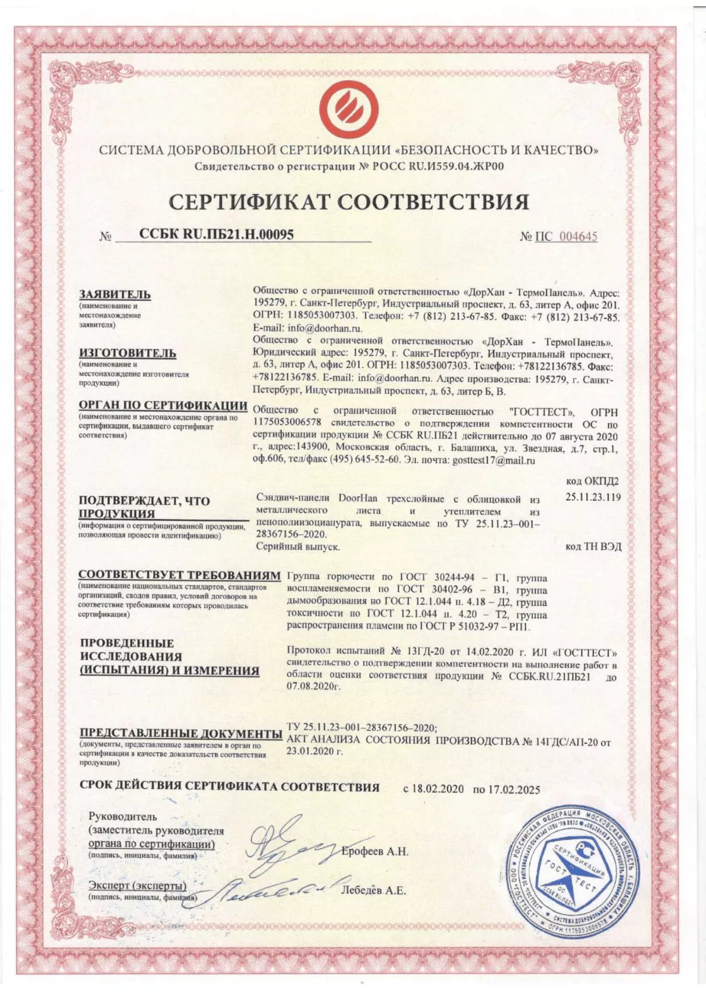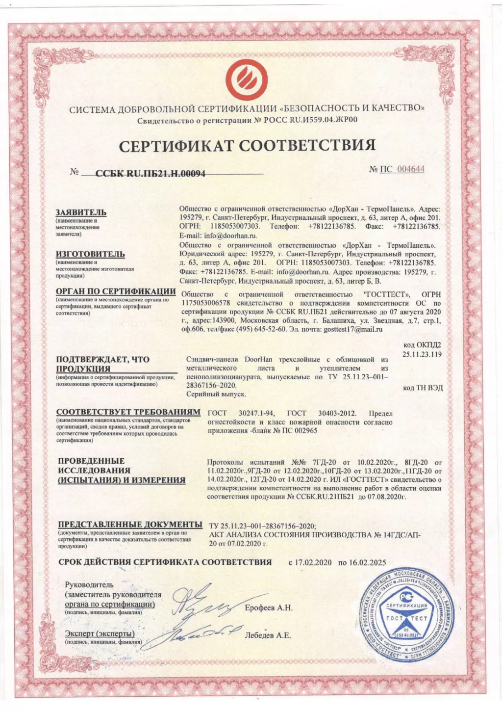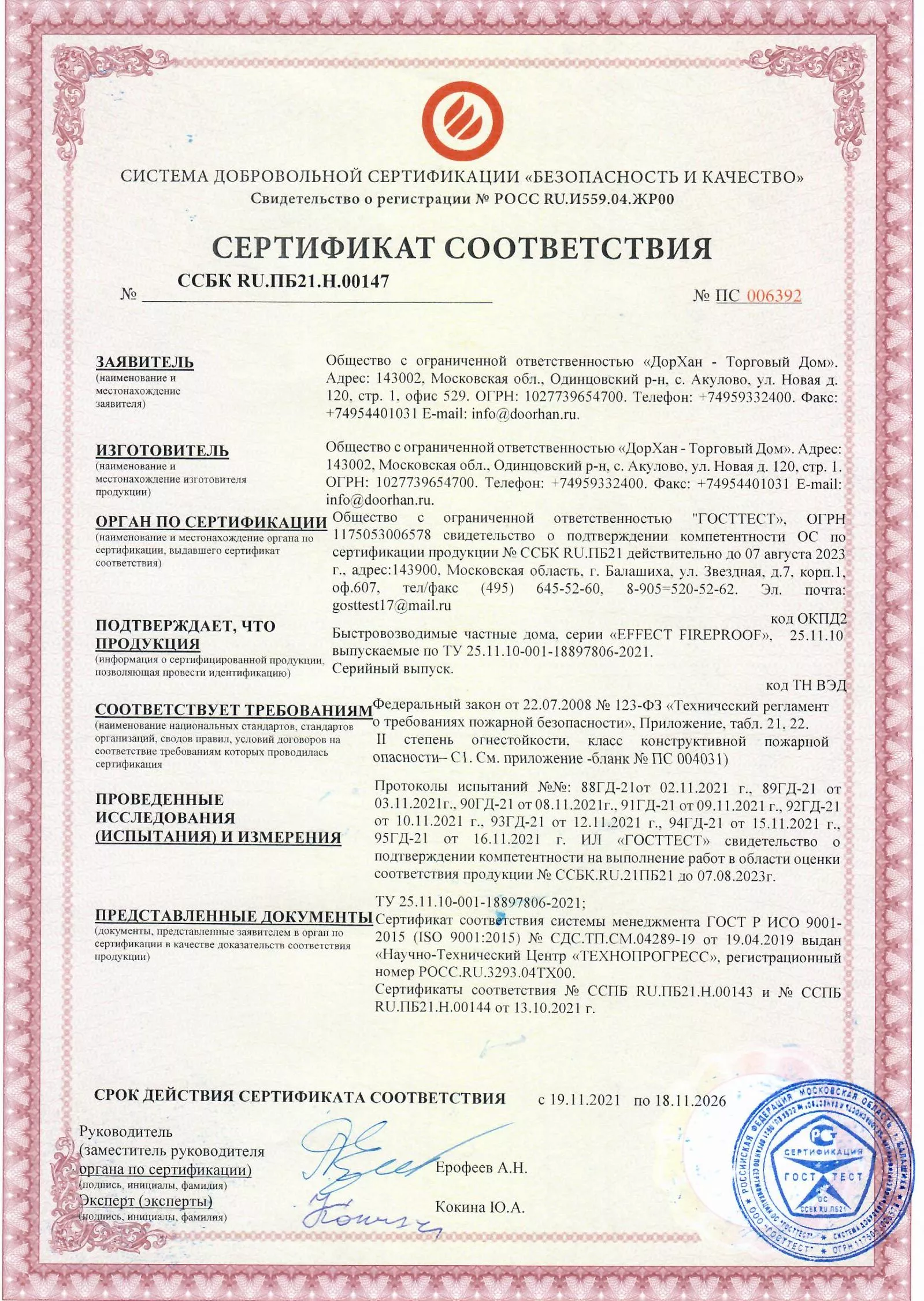 Домокомплекты изготавливаются в соответствие с нормами пожарной безопасности. При производстве домов серии DoorHan используются негорючие и слабогорючие материалы (стальные элементы) и утеплители (ПИР), которые разрешено применять даже на объектах с высоким риском возникновения пожара.