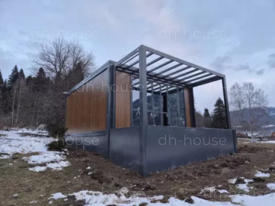 - металлокаркас из строительных конструкций типа Prefab, с утепленными рамами и угловыми стойками;